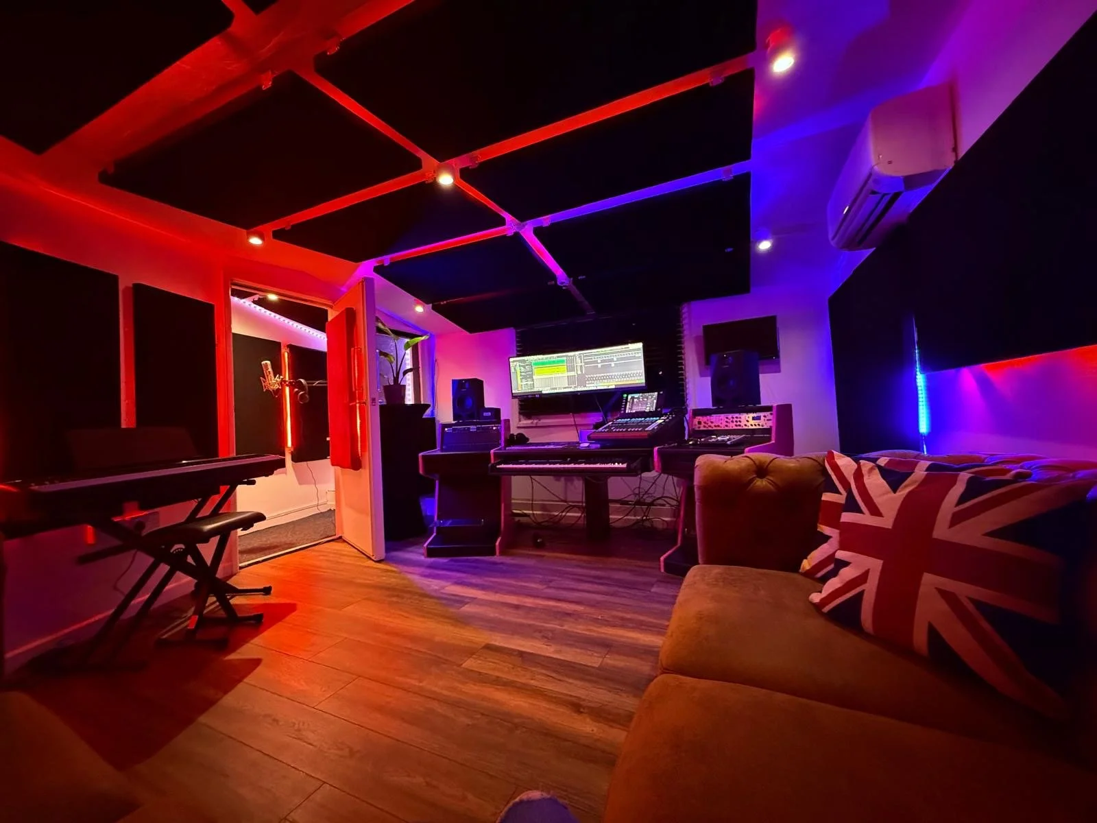A music production workspace with a computer monitor, a microphone, a pair of headphones, a MIDI keyboard, a synthesizer, a mixing console, and studio monitor speakers, illuminated by vibrant purple and pink lighting.