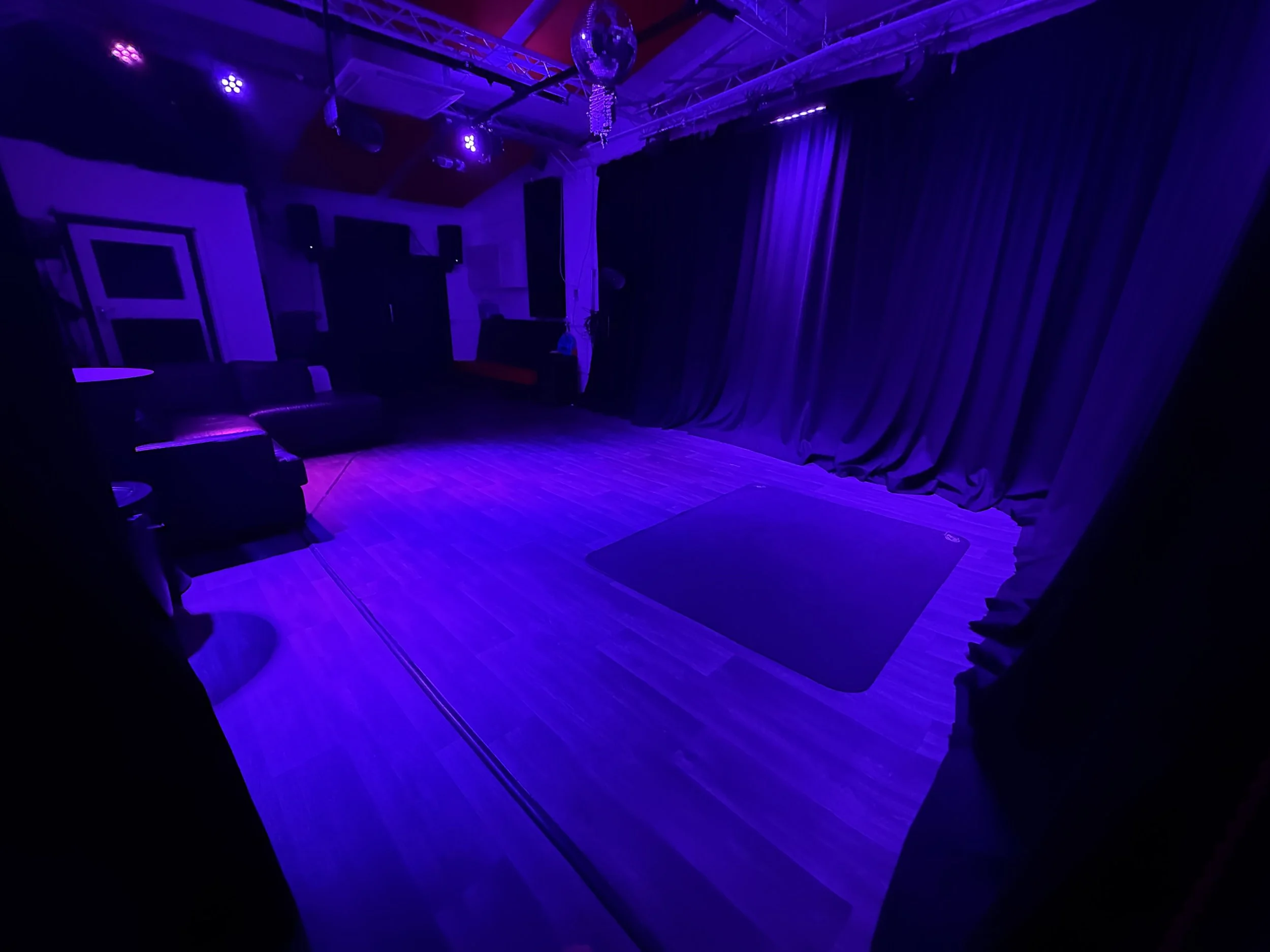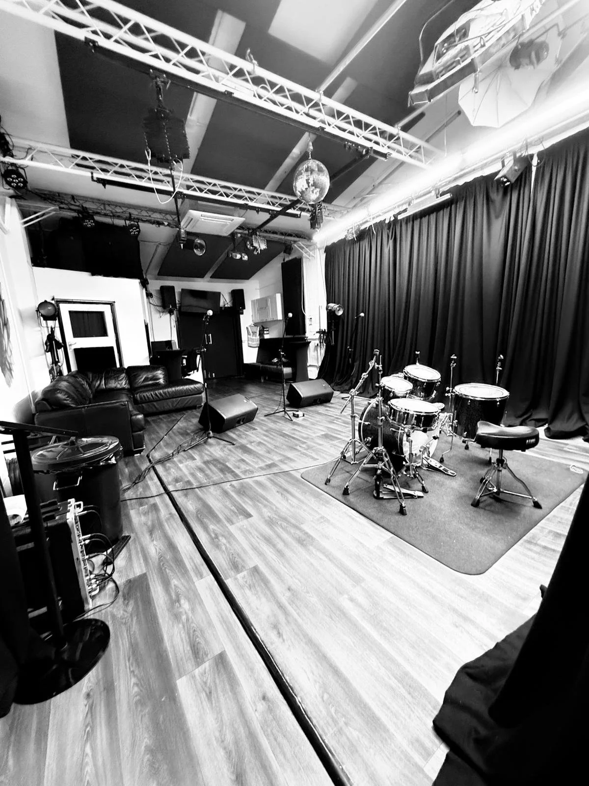 Empty music performance stage with drums, microphones, and amplifiers, set against black curtains in a studio or small venue.