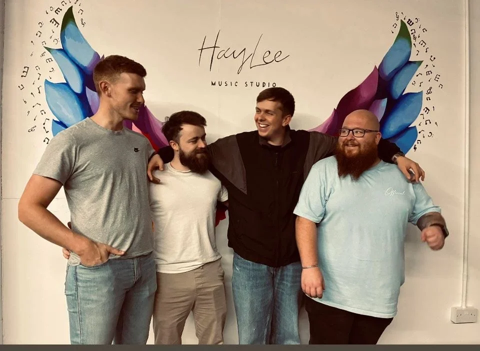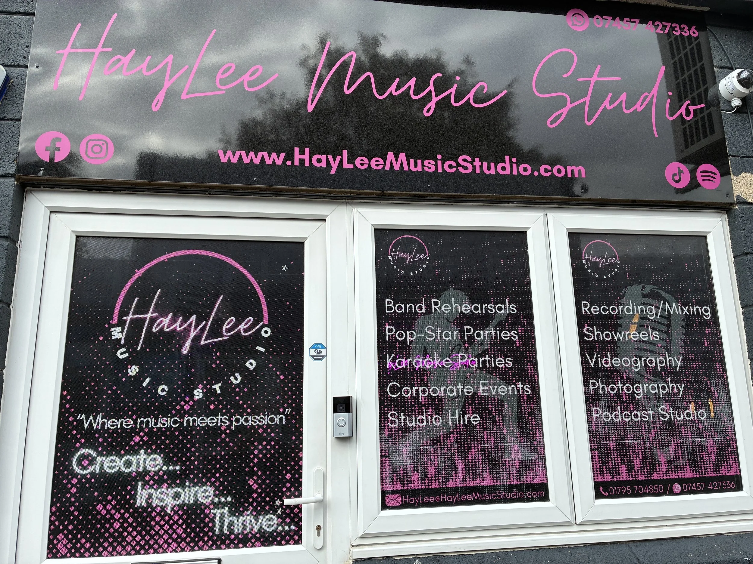 Sign for HayLee Music Studio with services listed, including recording, showreels, band rehearsals, and podcast studio, with a front entrance arrow and social media icons.