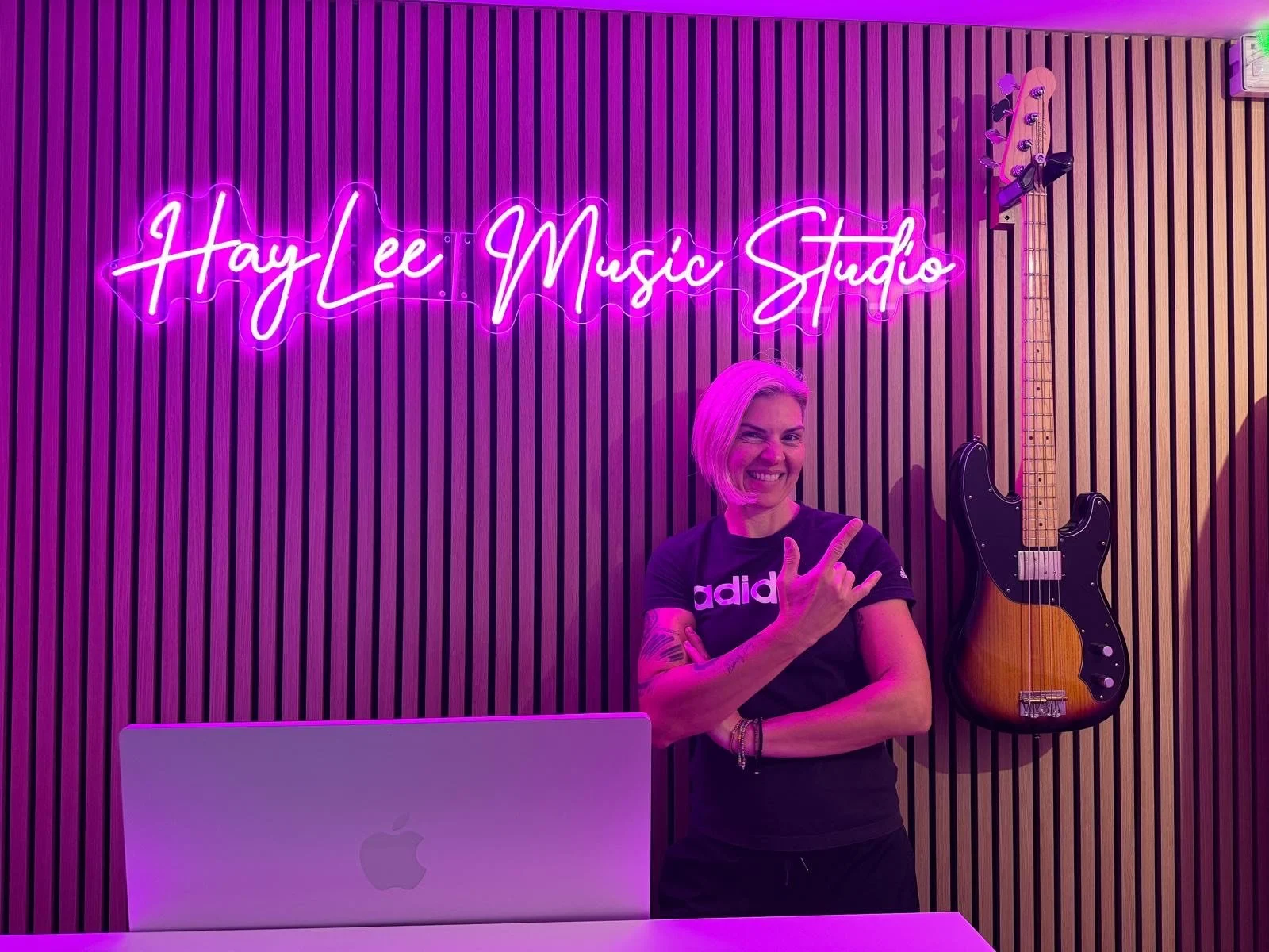 White reception desk in front of a wooden slat wall with a neon pink sign reading 'Hay Lee Music Studio'. A silver Apple computer is on the desk, with purple lighting reflecting on the desk surface.